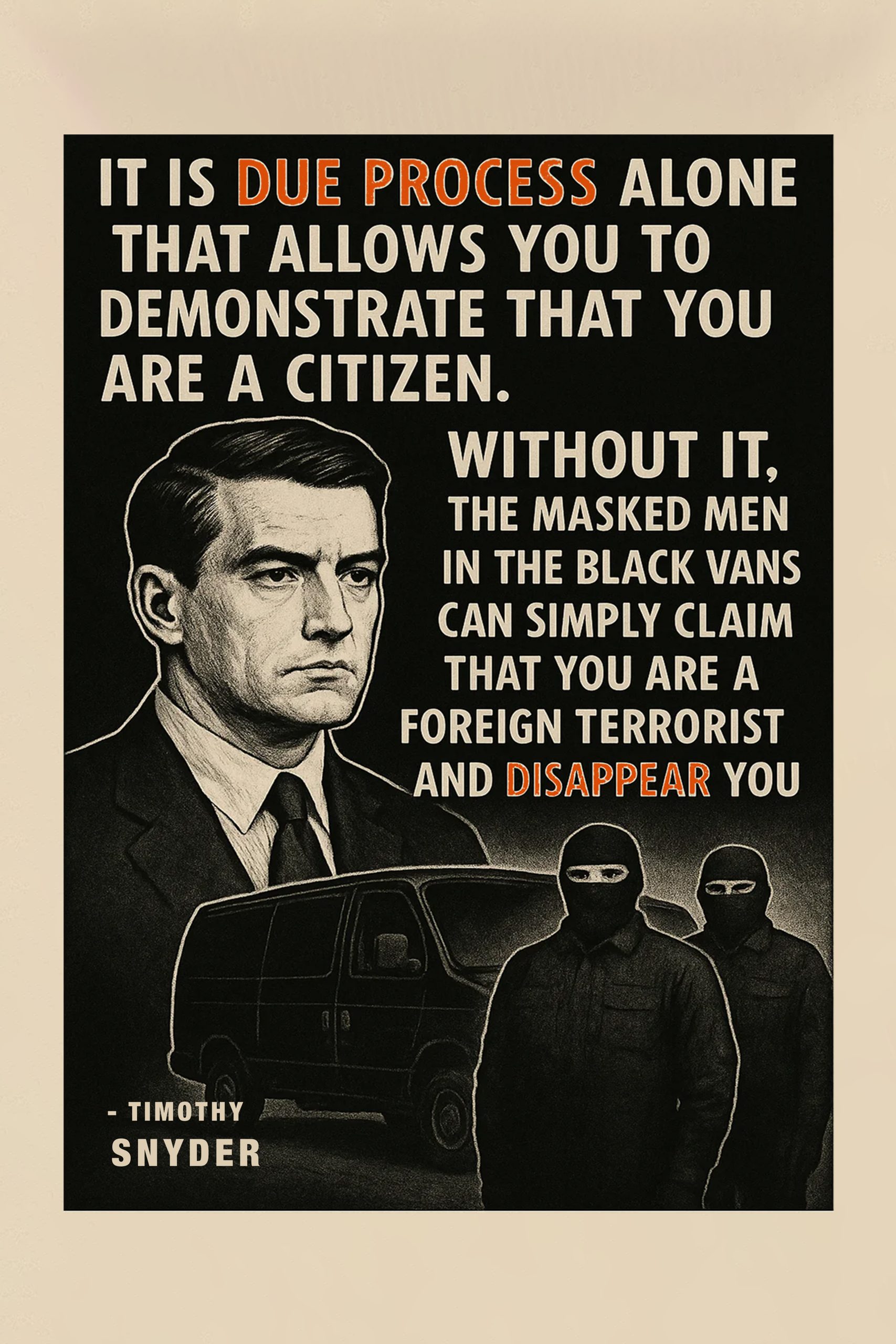 Men wearing tactical jackets and full hoods with only their eyes showing stand menacingly in front of a black van. A white man in a suit with a sober expression stares into space. The caption reads: "It is due process alone that allows you to demonstrate that you are a citizen. Without it, the masked men in the black vans can simply claim that you are a foreign terrorist and disappear you." Quote attributed to Timothy Snyder. We know that a white man has the least to fear from masked men in the US at the time of this writing. But already the list is expanding, and no-one in the way of authoritarianism is immune from the new machinery of oppression. Pick the closest one to the size you want and crop to fit your format.